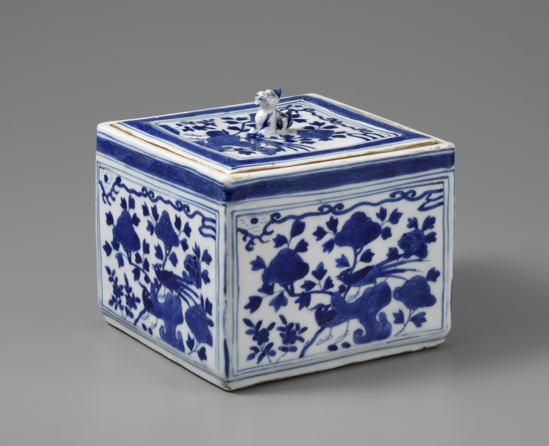 Blue and white porcelain four-sided water jug with matching lid, Wanli era
