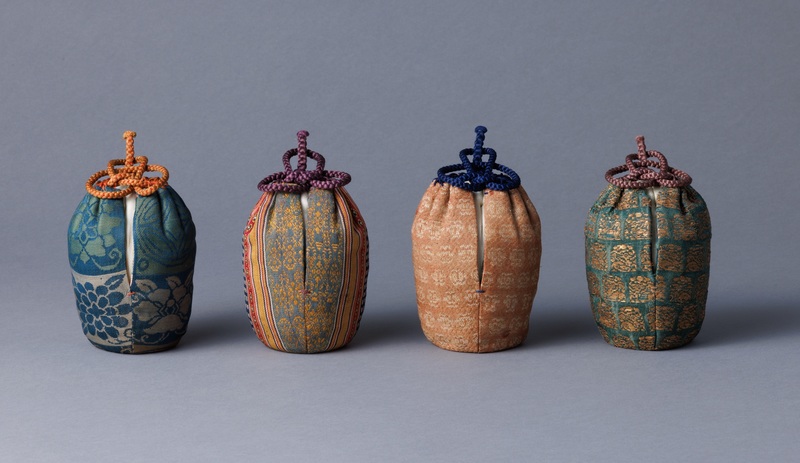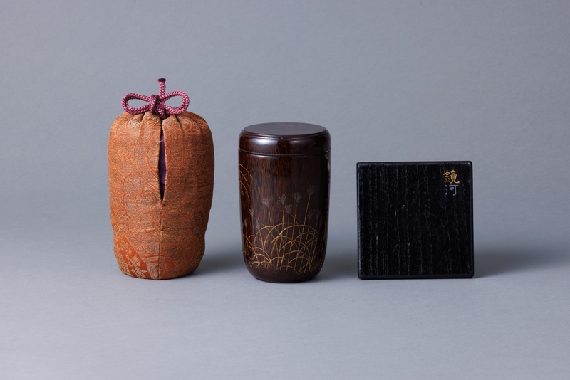 Enshu box, Hirase Roko outer box, silk tea caddy pouch, daitogire fabric, flowers and rabbits on light green background, kunaikanto fabric, enshudonsu fabric, tea caddy container, cassia and inlaid gold susuki grass design, silver on vermilion woolen fabric