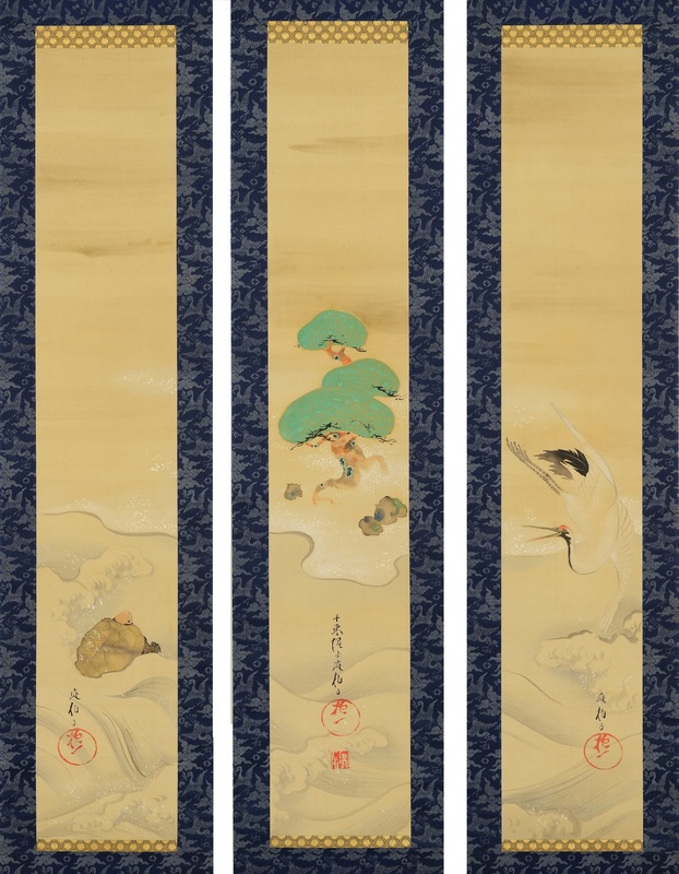 Triptych of pine, crane, and turtle illustrations