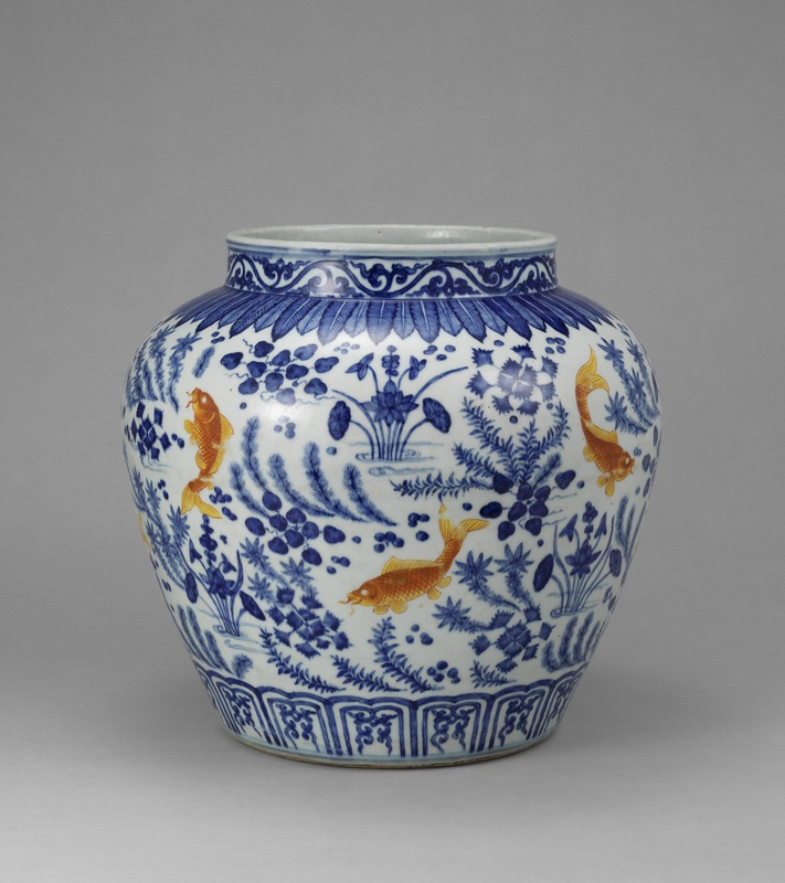 Large round jar with red fish and seaweed design on yellow background, Jiajing era, Ming dynasty