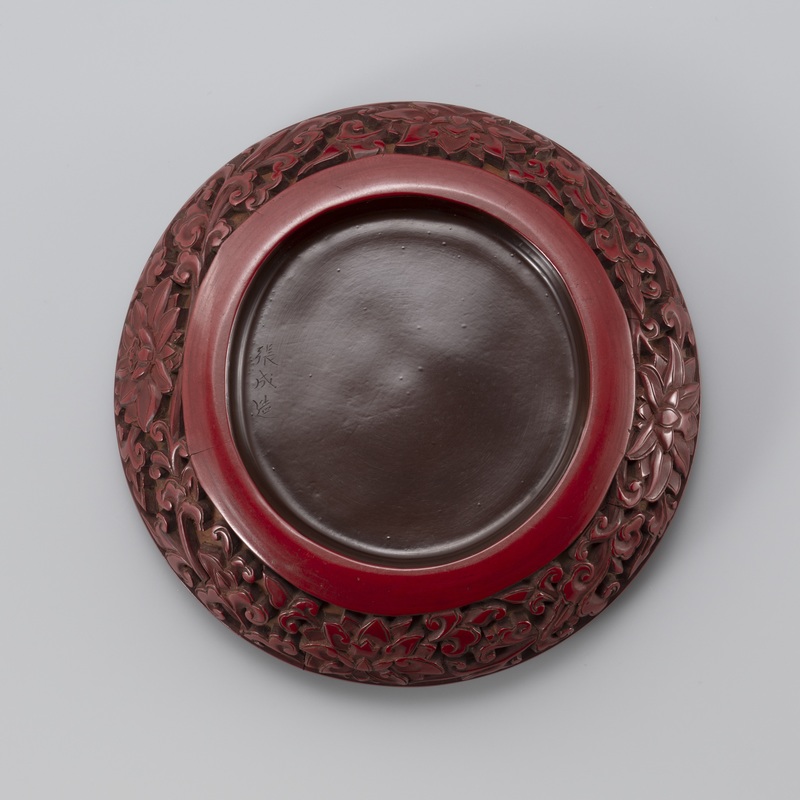 Vermilion lacquer incense box with carved peony and arabasque design