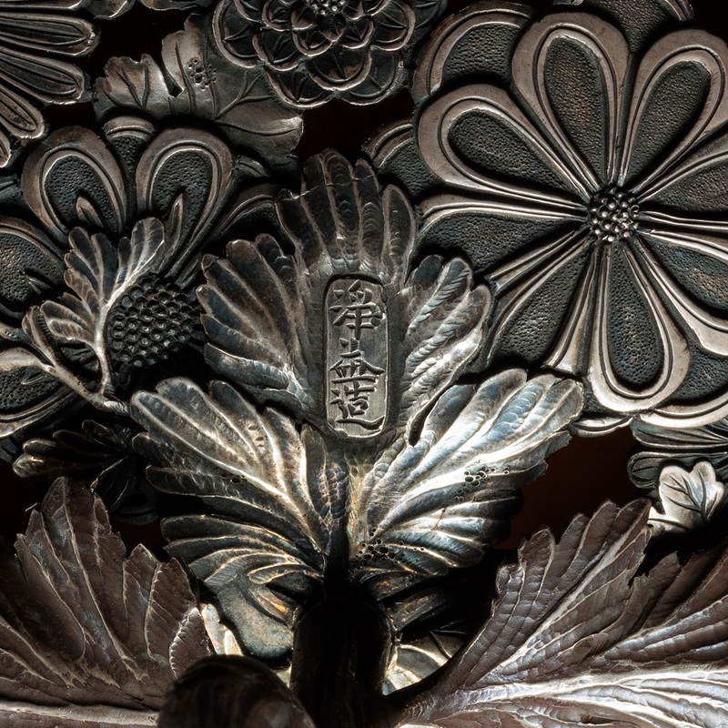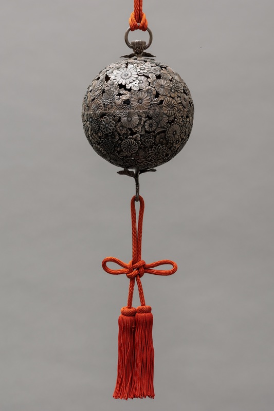 Fine silver hanging incense burner with openwork chrysanthemum design